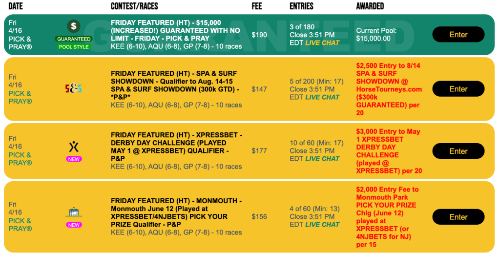There’s also a Monmouth Pick Your Prize Pick & Pray qualifier on Friday. One of every 15 entries, at $156 per entry, earns a $2,000 seat for the June 12th test. It can be played on the 12th at Monmouth, at Xpressbet or—if you live in New Jersey—4NJBets.