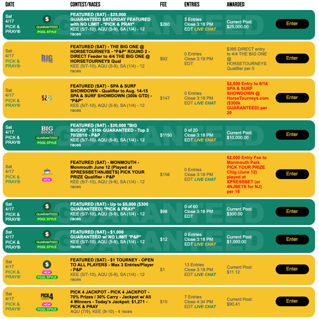 In addition to the debut of the $177, 1-per-20 Derby Day Challenge Pick & Pray, there’s a $147, 1-per-20 Pick & Pray to the $300,000 Guaranteed Spa & Surf Showdown here on August 14-15. Winner(s) receive a $2,500 entry.