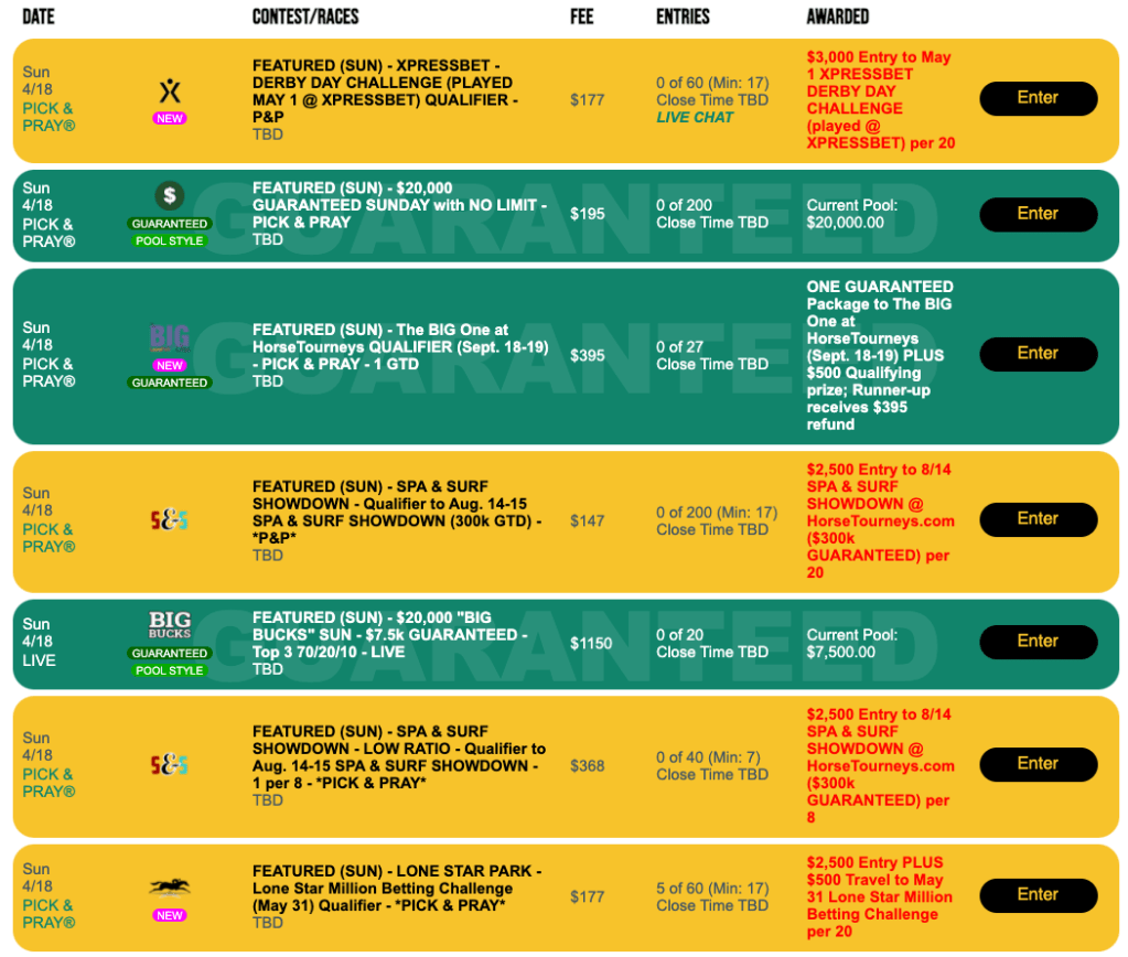 On Sunday we offer our second Derby Day Challenge qualifier of the weekend (see Friday). It’s a 1-per-20 Pick & Pray with an entry charge of $177 and a $3,000 Derby Day Challenge entry waiting at the end.