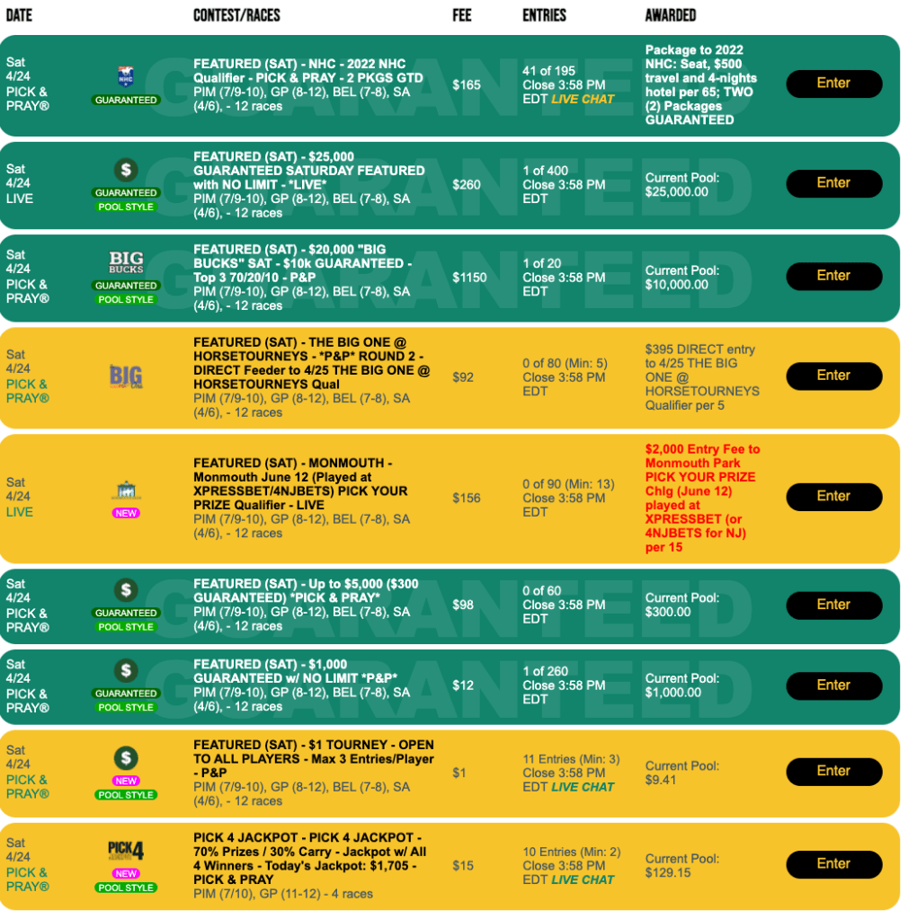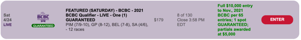 There’s an NHC qualifier right here at HorseTourneys on Saturday. It’s a “regular,” $165 Pick & Pray with two spots certain and a winning ratio of 1-per-65.