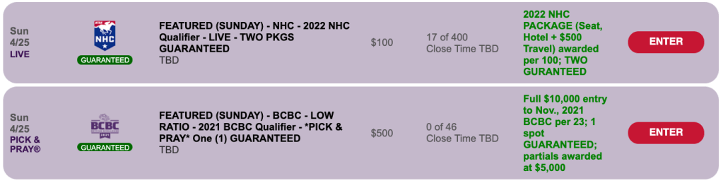 The day’s NHC qualifier is a special, $100 play-in. Two seats to the 2022 event are guaranteed in this live-format affair. The winning ratio is 1-per-100.