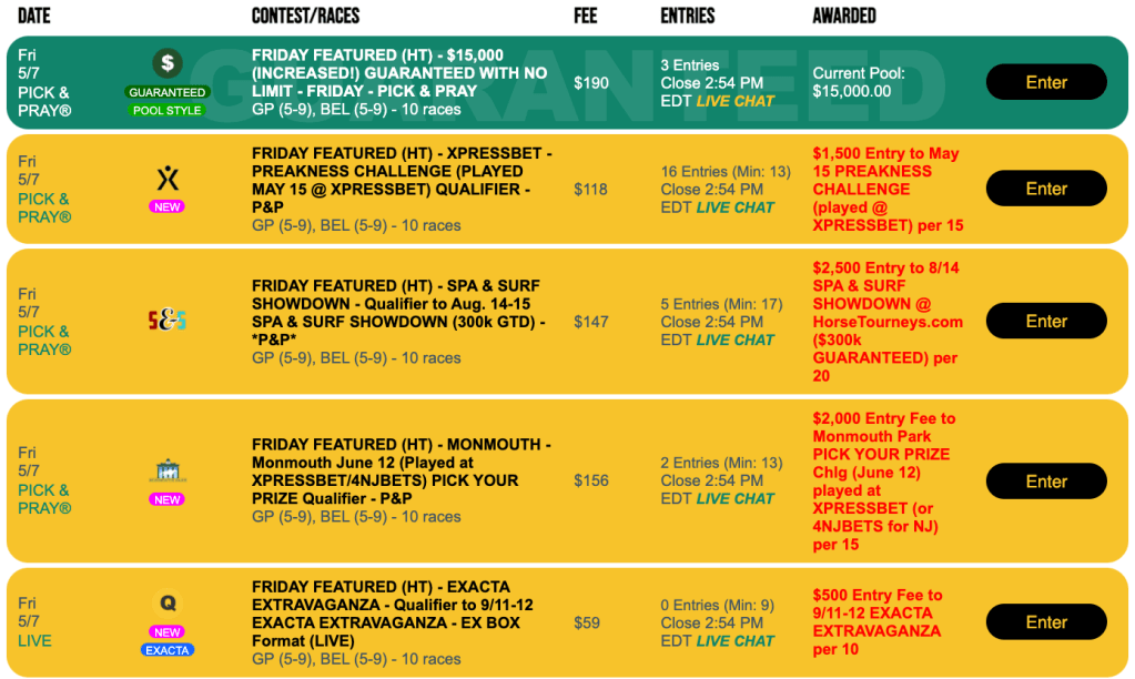 The first of two weekend play-ins to the Preakness Challenge is part of the Friday slate. The entry fee is $118, the winning ratio is 1-per-15, and the prize people will be shooting for in this Pick & Pray is a $1,500 seat in the Xpressbet contest a week from Saturday.