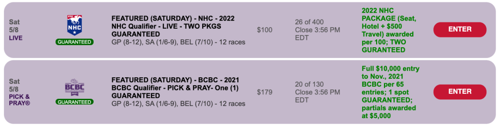 Our Monmouth Pick Your Prize qualifiers also make their second of three weekend appearances on Saturday. The entry fee here is $156, and the winning ratio is 1-per-15, with the winner(s) getting a $2,000 Monmouth entry.