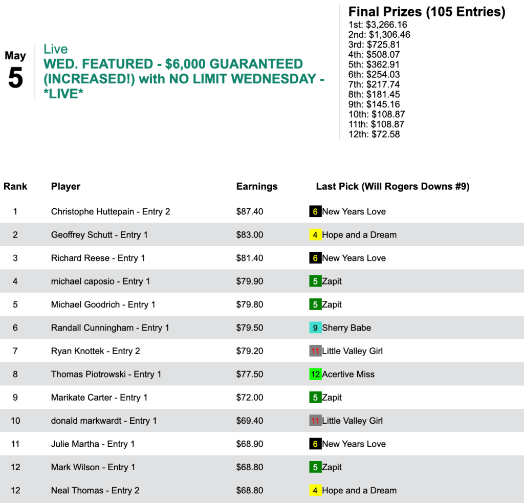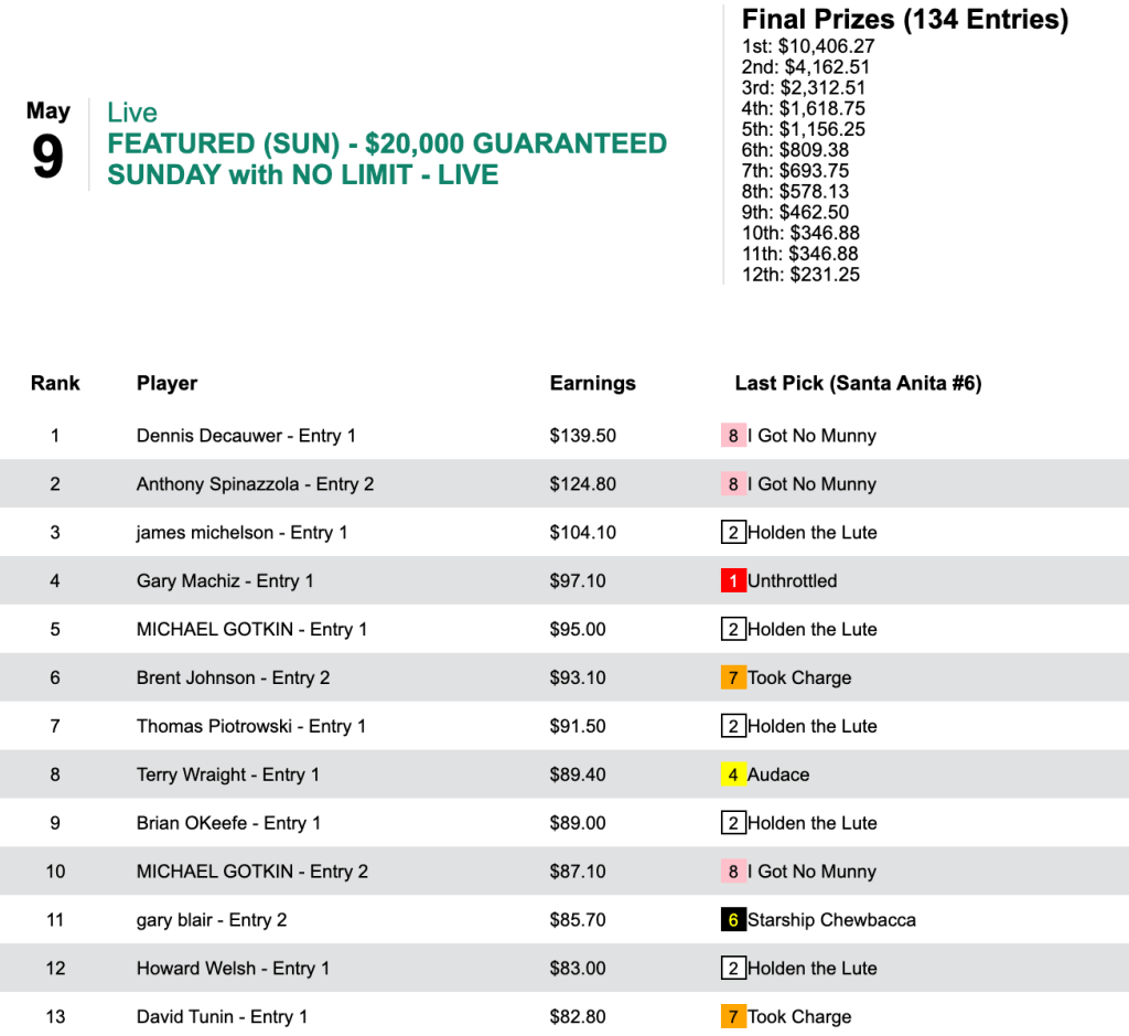 It’s hard to improve on your performance a day after winning an NHC seat, but Christopher Olsson did just that, following up Saturday’s second-place finish with a top-of-the-heap showing on Sunday. He did it with 5 winners, including three in the last three races of the contest. Sunday’s other ticket-puncher, Phil Hoedebeck (4 wins, 0 places) also had a Zenyatta-Like finish. He did all of his collecting over the final 5 races.