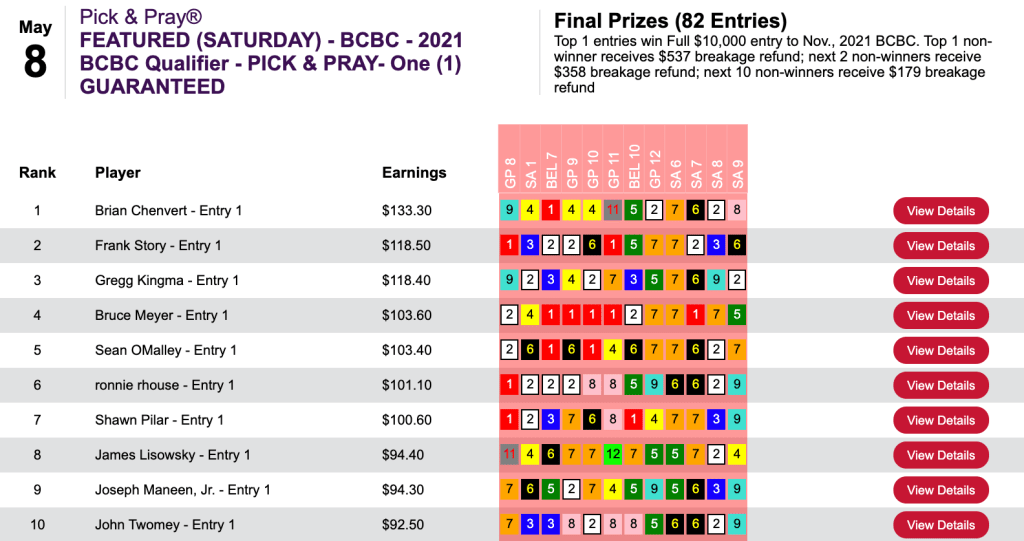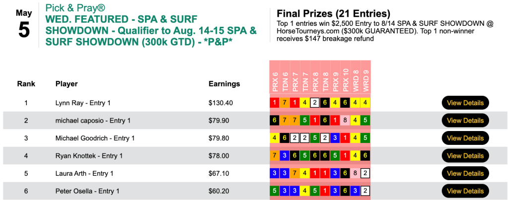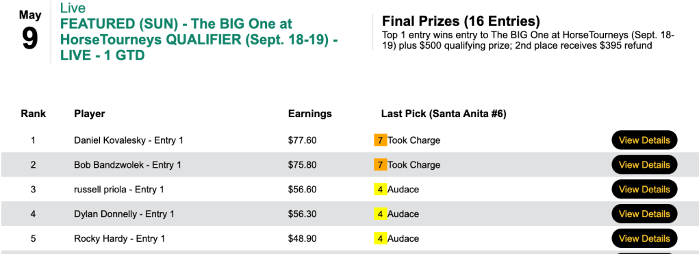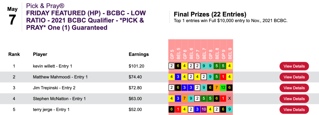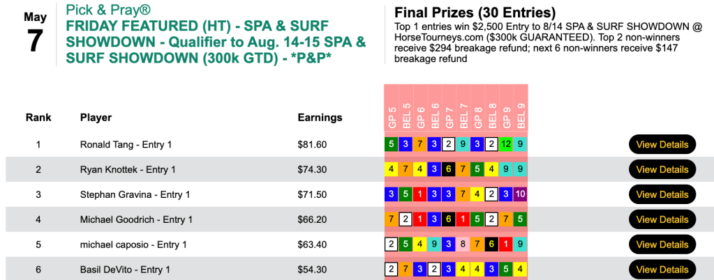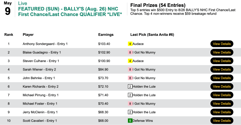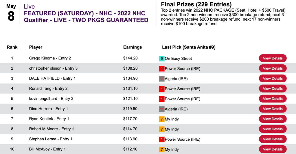 That 5-win, 2-place tally came in Saturday’s $100 NHC qualifier at HorsePlayers.
