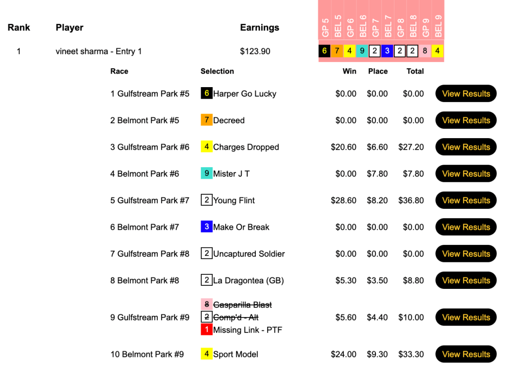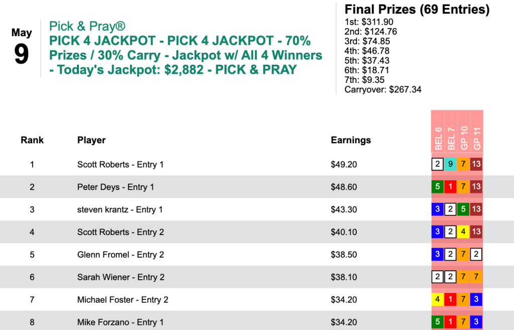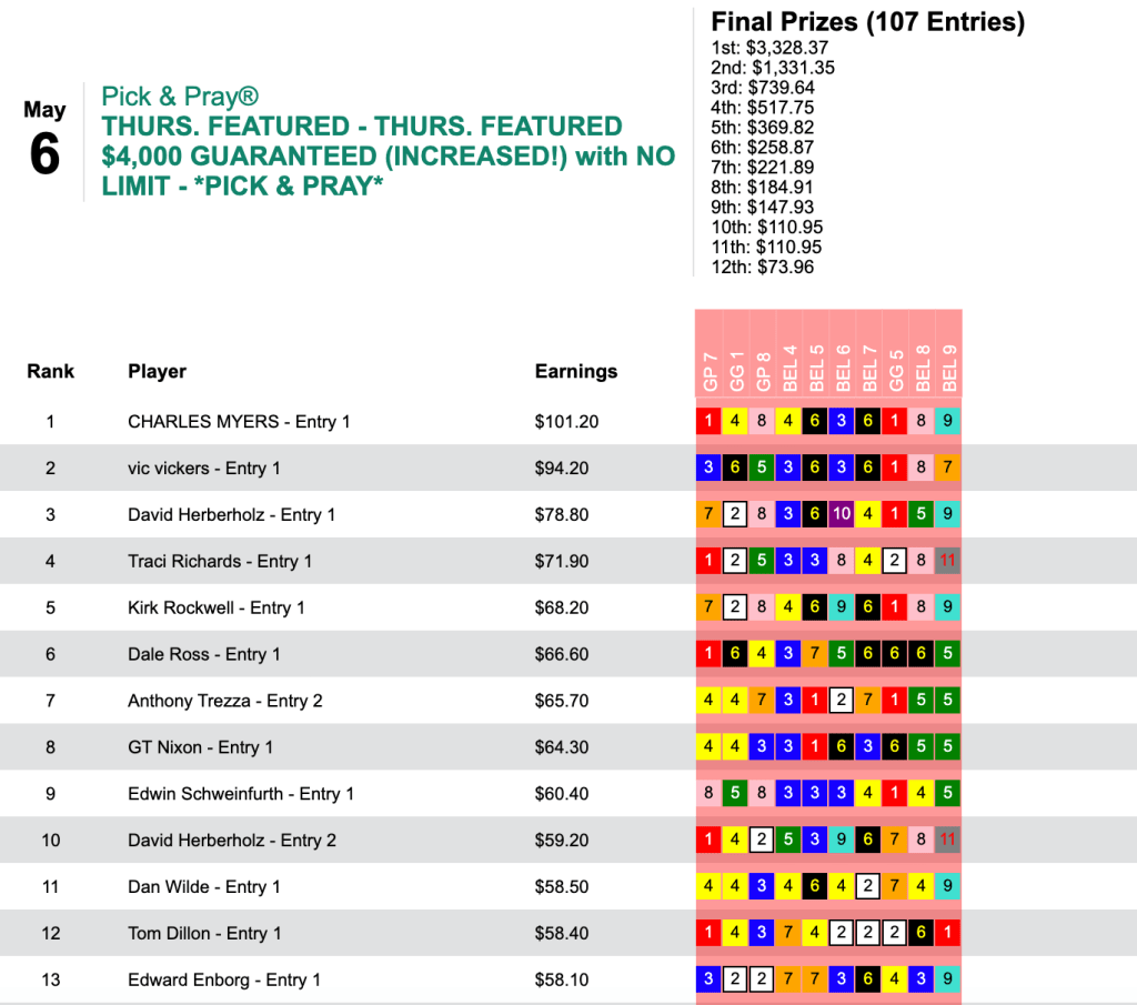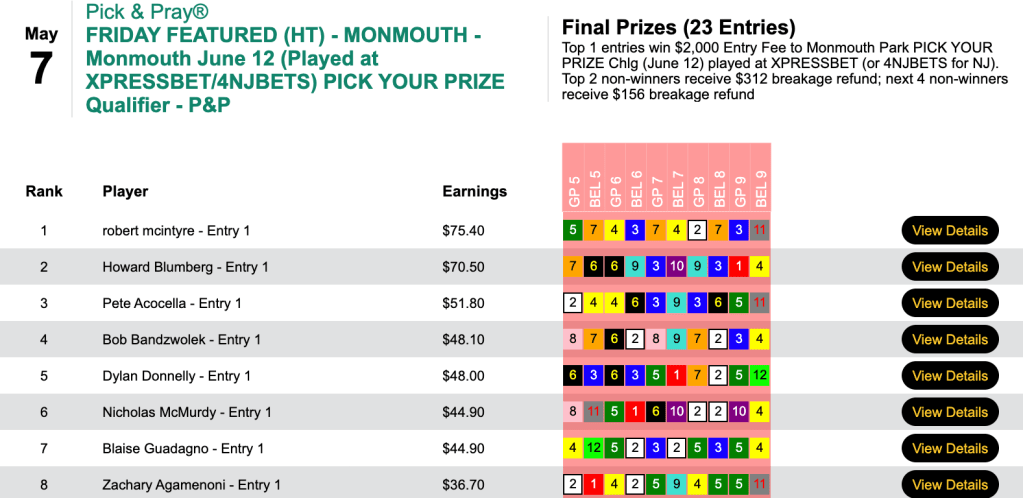 Robert McIntyre nailed Charges Dropped ($20.60 to win in the 6th at Gulfstream) and Matty’s Marauder ($24.80 in the 6th at Belmont) in consecutive tourney races to finish with 3 wins and no places in Friday’s Monmouth Pick Your Prize Pick & Pray play-in.