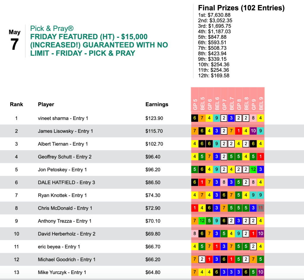 It came in a good spot—Friday’s $15,000 Guaranteed Pick & Pray with a final pot of $16,957—and Sharma was rewarded to the tune of $7,630. Here’s what his scorecard looked like: