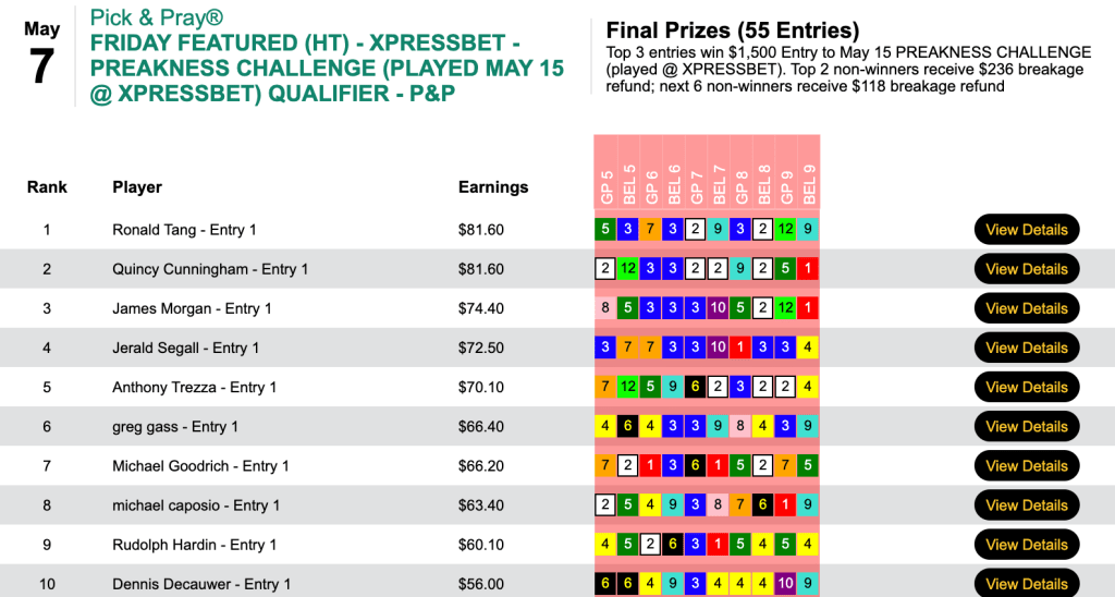 Breaking the tie was no issue, though, since this qualifier for the Preakness Challenge at Xpressbet had enough entries to award three $1,500 seats. The third of those three went to “The Captain” James Morgan who compiled 4 firsts and 2 seconds.