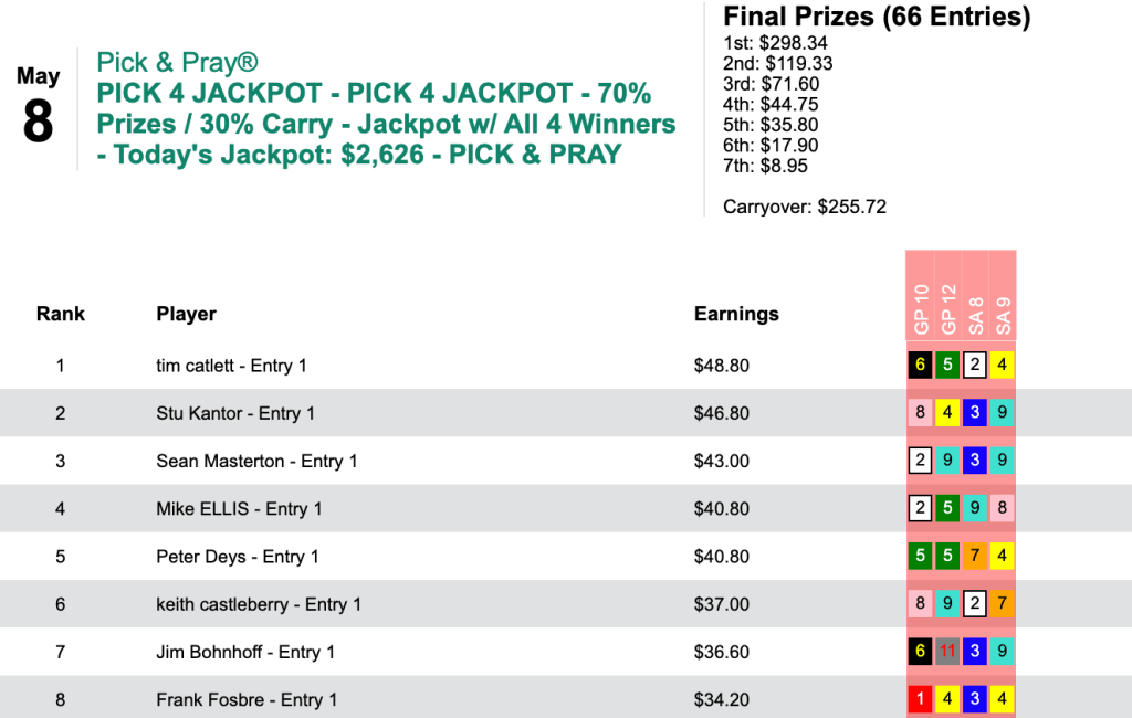Tim Catlett (1 winner, 1 place) and Scott Roberts (2W, 1P) came in first in their respective $15 Pick 4 Jackpot tourneys over the weekend.