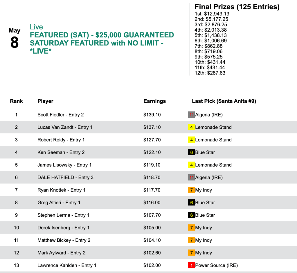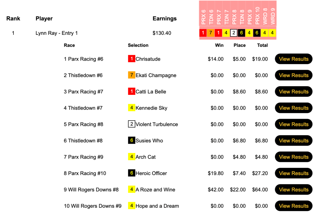 Fiedler picked 6 winners—ranging in price from 2-1 to 13-1—and 1 runner up to cross the wire first in the game that finished up with a final pot of $28,762.