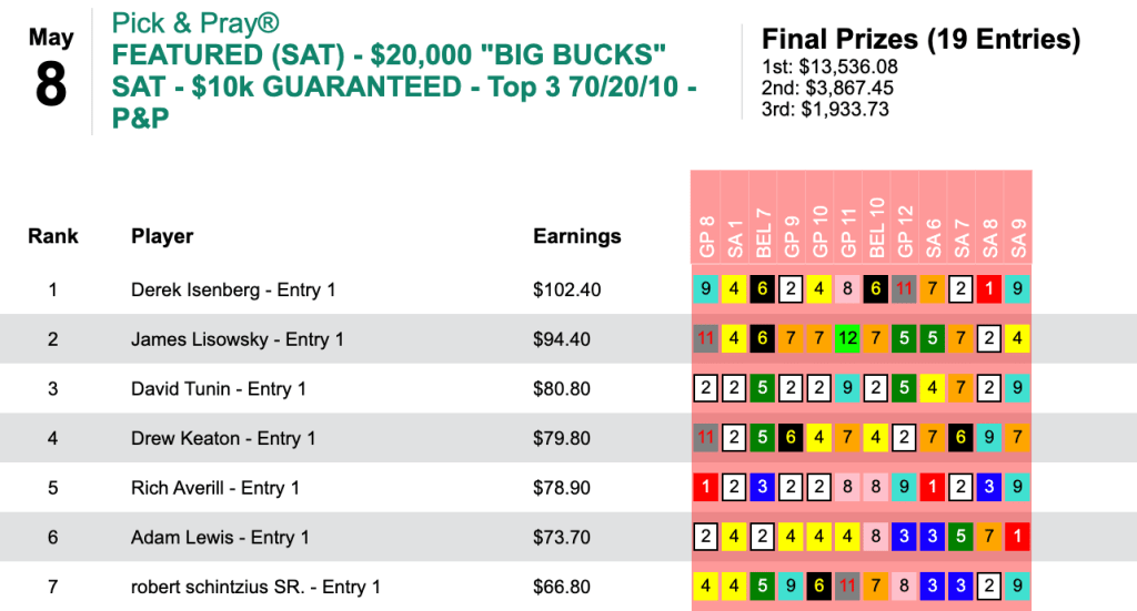 The event with the week’s highest winner’s share was Saturday’s $10,000 Guaranteed Big Bucks Pick & Pray.