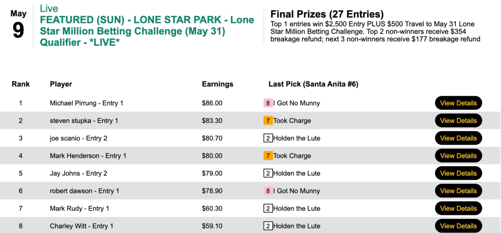 Pirrung (3 firsts, 1 second) collected in the final three races, capped off crucially by I Got No Munny ($9.60, $5.40) in the final tourney race, race 6 at Santa Anita.