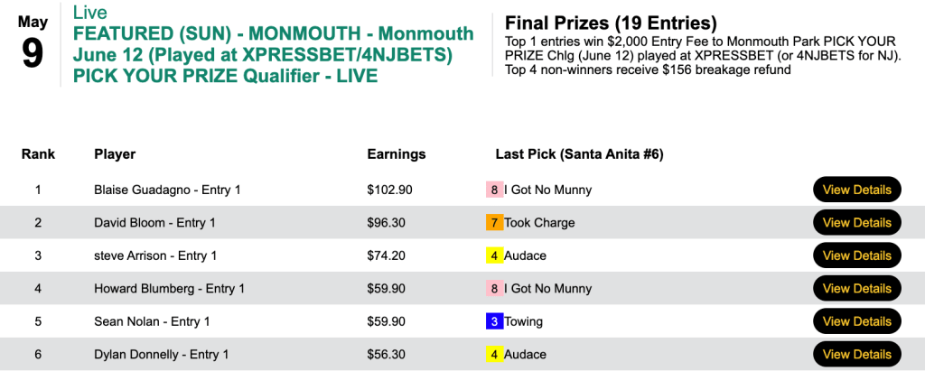 As a result, Guadagno will be in the starting gate on June 12th with his $2,000 entry fee already taken care of in the Monmouth Pick Your Prize tournament.