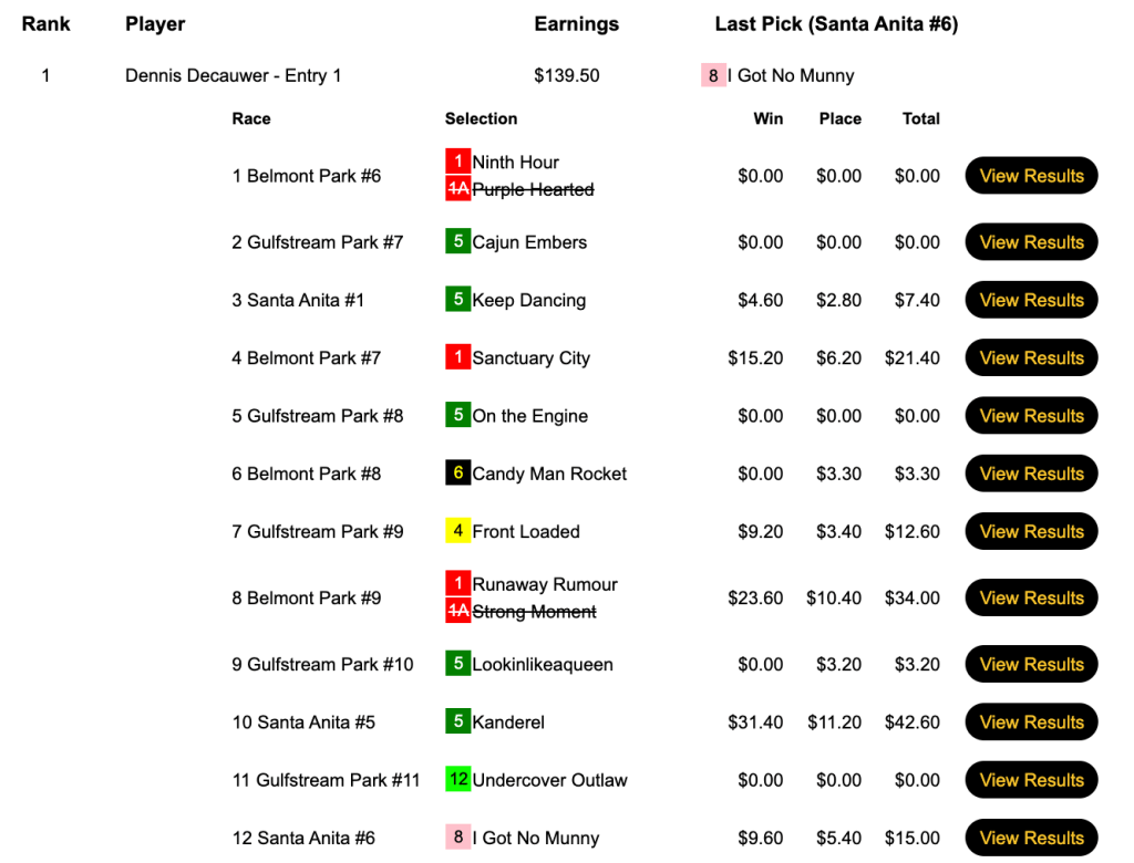 Thanks in part to his selection of Matty’s Marauder ($24.80, $11.20) in the 6th at Belmont, Christophe left everyone except Geoffrey Schutt in pain at the conclusion of Friday’s $75 NHC Pick & Pray. Like Huttepain (3 wins, 1 place), Schutt (4W, 0P) also had Matty’s Marauder en route to his 2022 NHC berth.