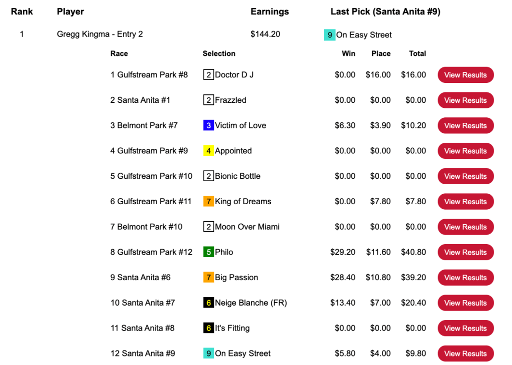 Derek Isenberg (4 wins, no places) caught On Easy Street ($5.80, $4.00) in the final race (Santa Anita’s 9th) to get up and win Saturday’s nearly-sold-out game that closed with a pot of $19,337. Isenberg’s portion (70%) of that came to a juicy $13,536.
