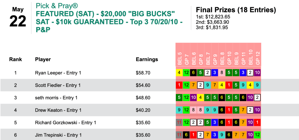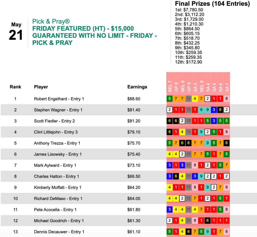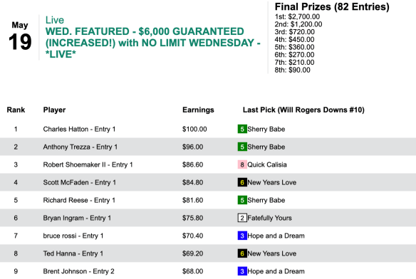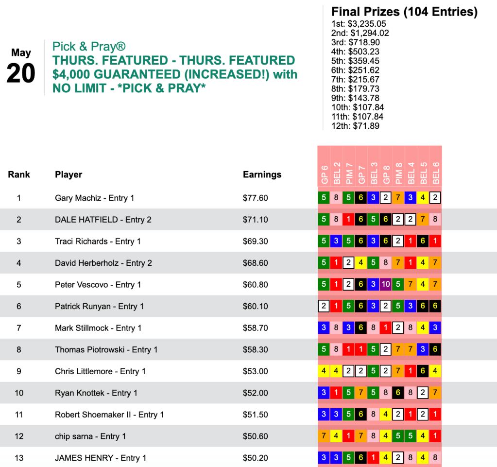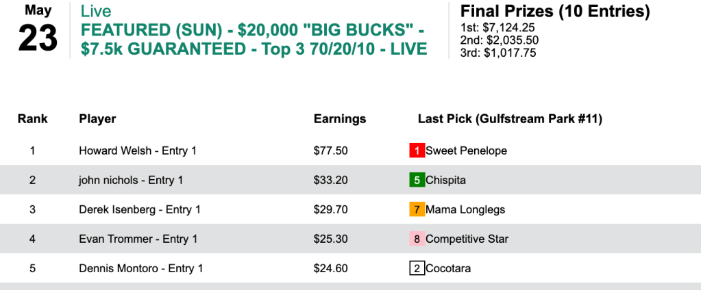 There were six featured tourneys on Friday, and the funny thing is…Morris’s total of $79.10 was the day’s lowest winning score. With those same picks and that same score, however, he managed to win two other Friday features.