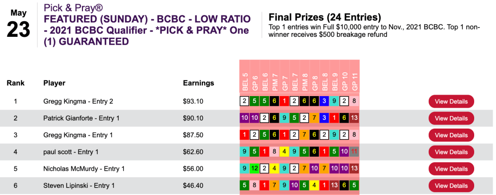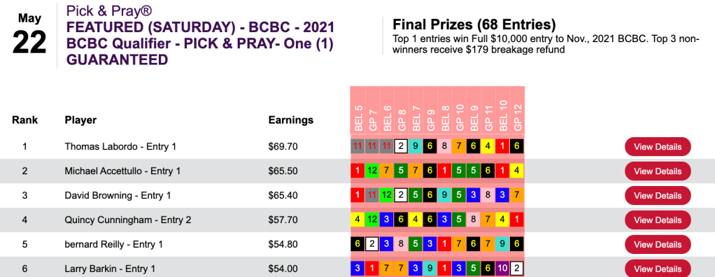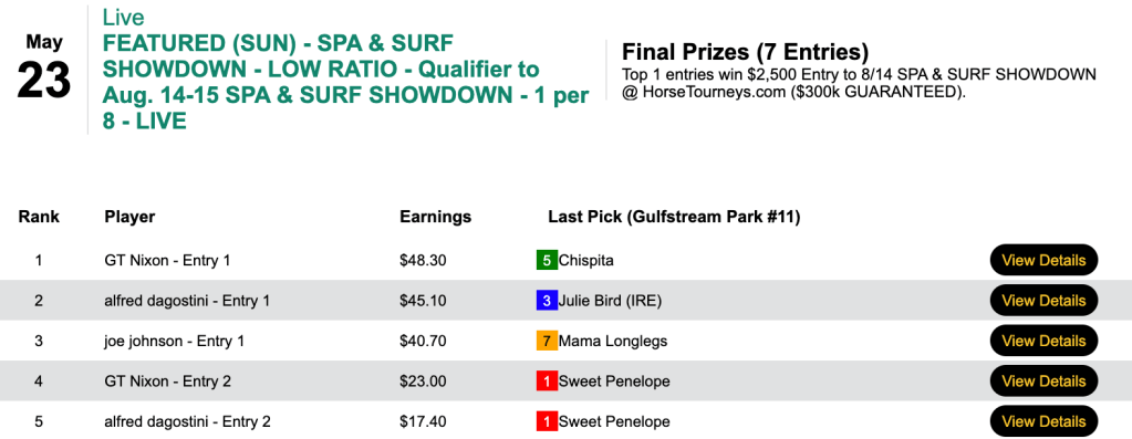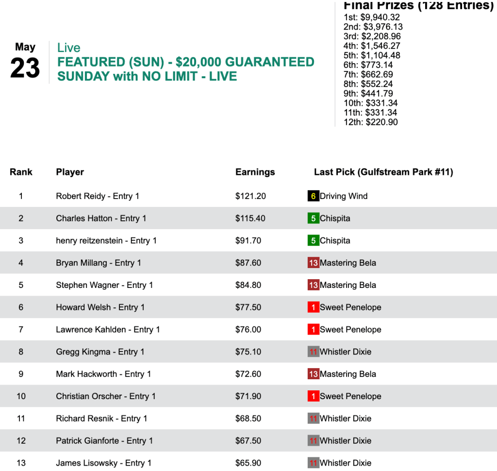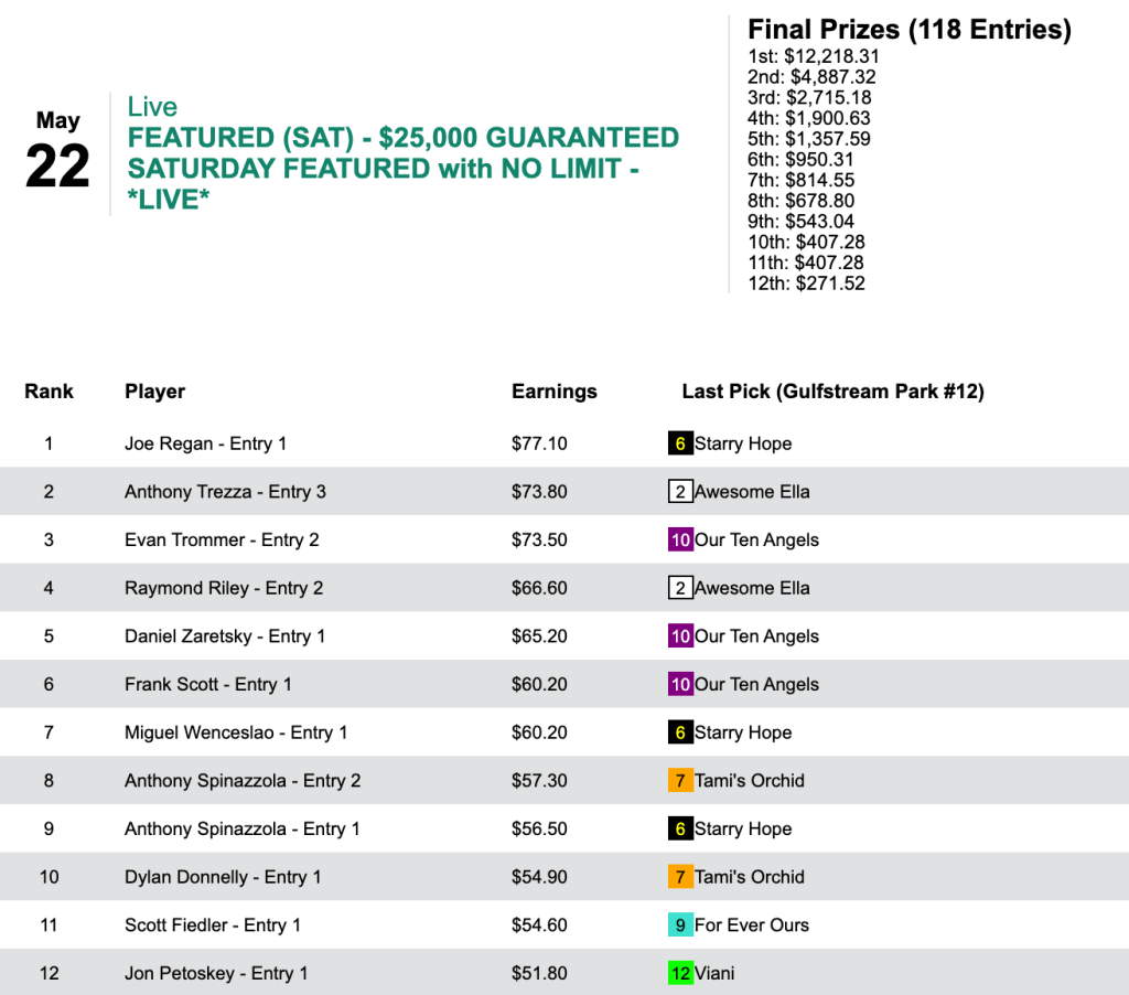 There were six featured tourneys on Friday, and the funny thing is…Morris’s total of $79.10 was the day’s lowest winning score. With those same picks and that same score, however, he managed to win two other Friday features.