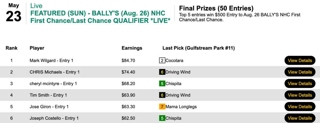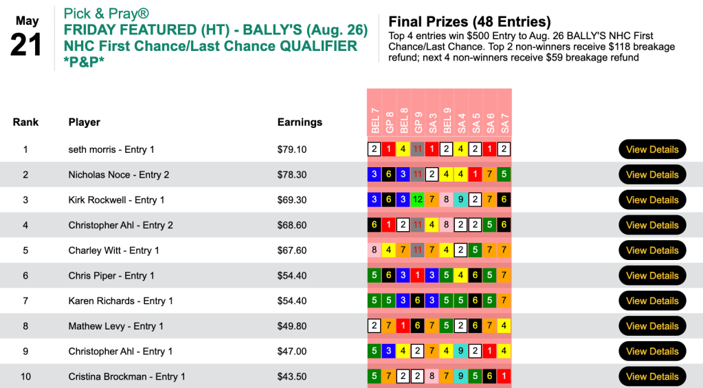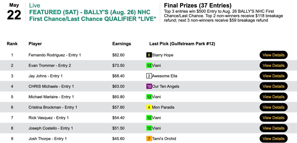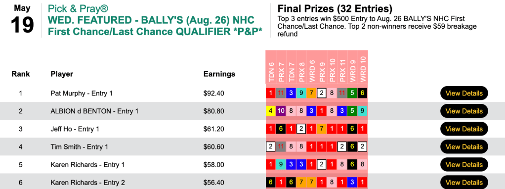 Trommer played those same picks—worth a collective $73.50—to get second place in Saturday’s Bally’s NHC First Chance/Last Chance qualifier.