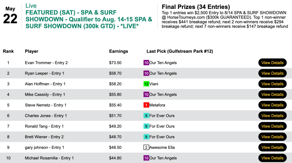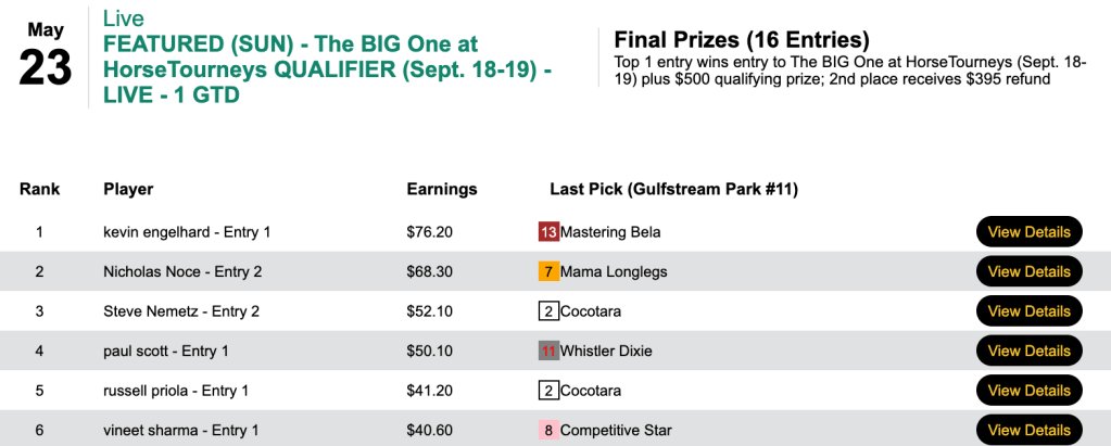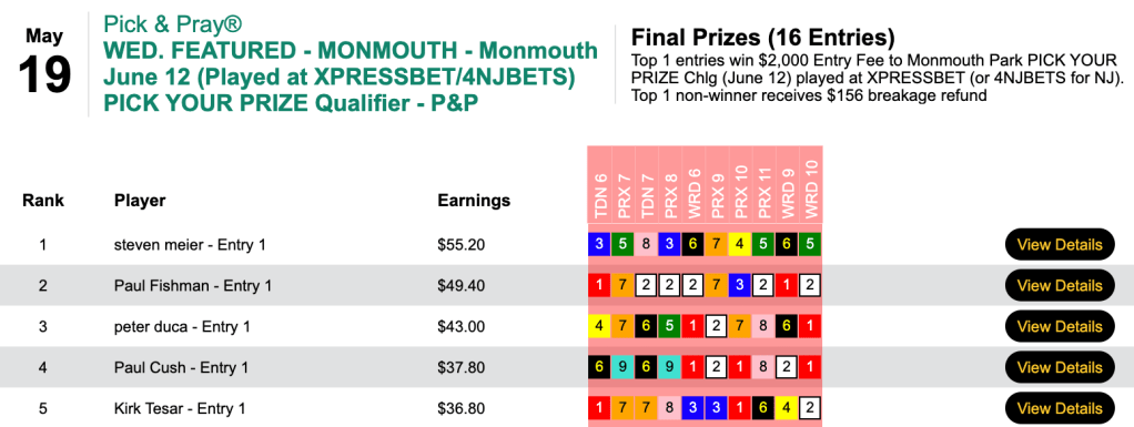 Meier’s reduced score still proved best, and that earned him a $2,000 place in the here-before-you-know-it Monmouth tournament which, on June 12th, can be played either onsite or online (Xpressbet or, for New Jersey residents, 4NJBets).