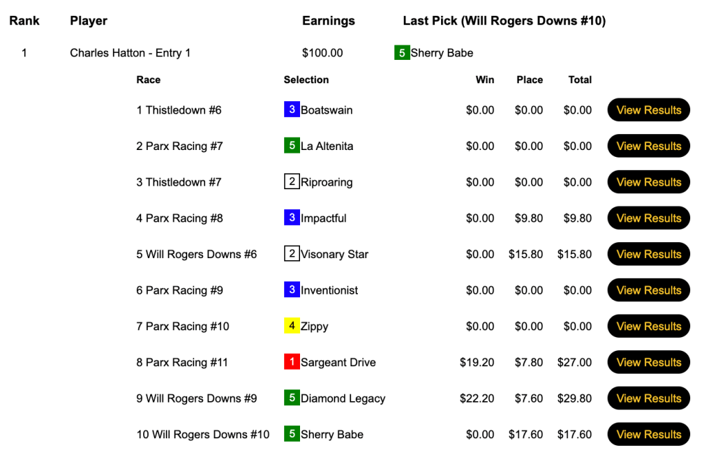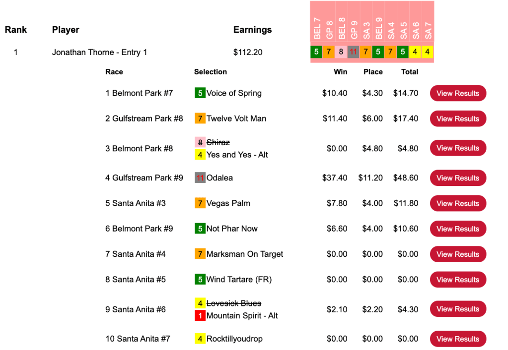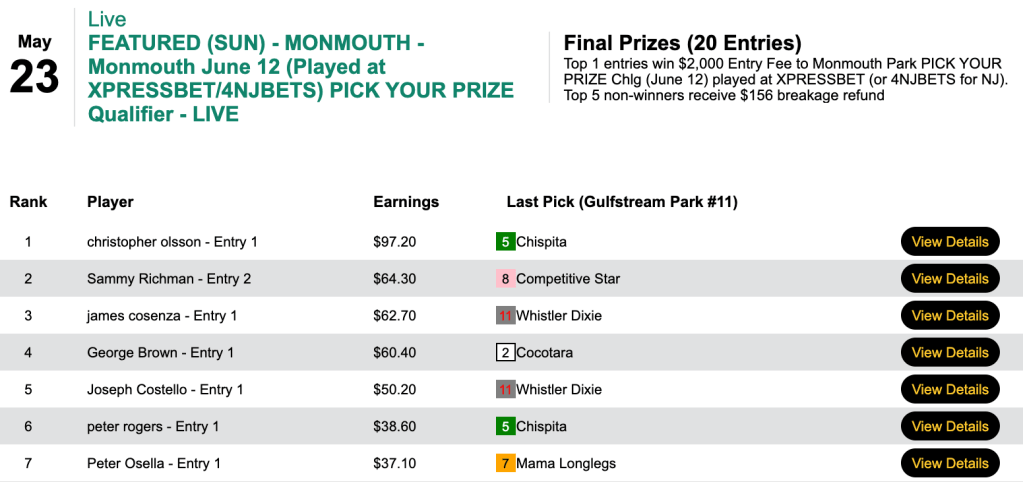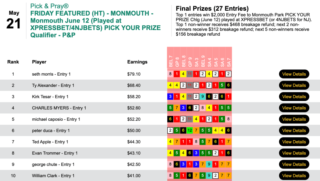 Morris had 2 winners and 2 places to capture Friday’s Monmouth Pick Your Prize qualifier. Here’s a look at his scorecard: