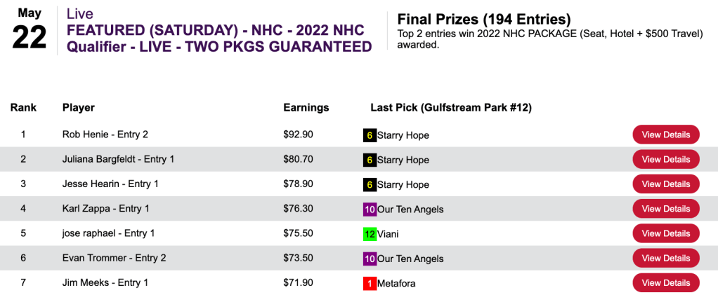As is typically the case, Friday’s high scoring total came from the day’s $75 NHC qualifier at HorsePlayers.