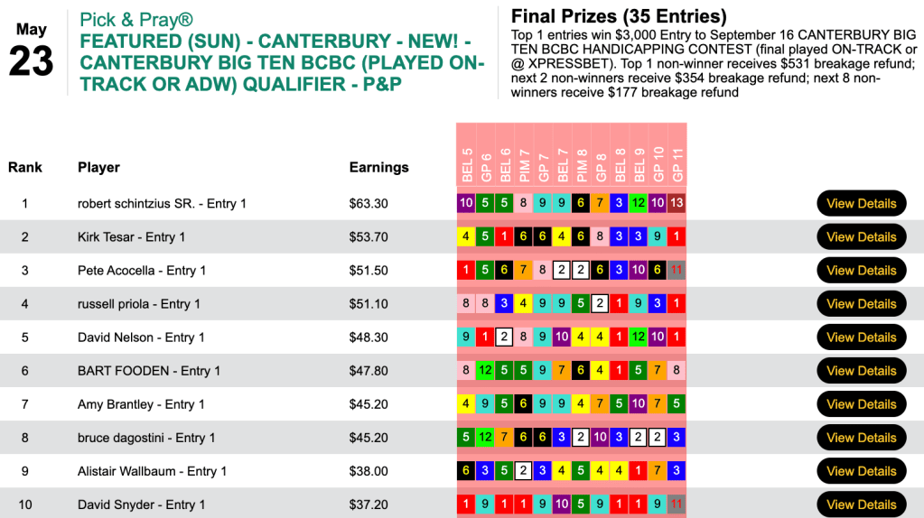 In our first qualifier for the new Canterbury Big 10 BCBC Handicapping Contest on September 16th, Robert Schintzius Sr. had just one winner.