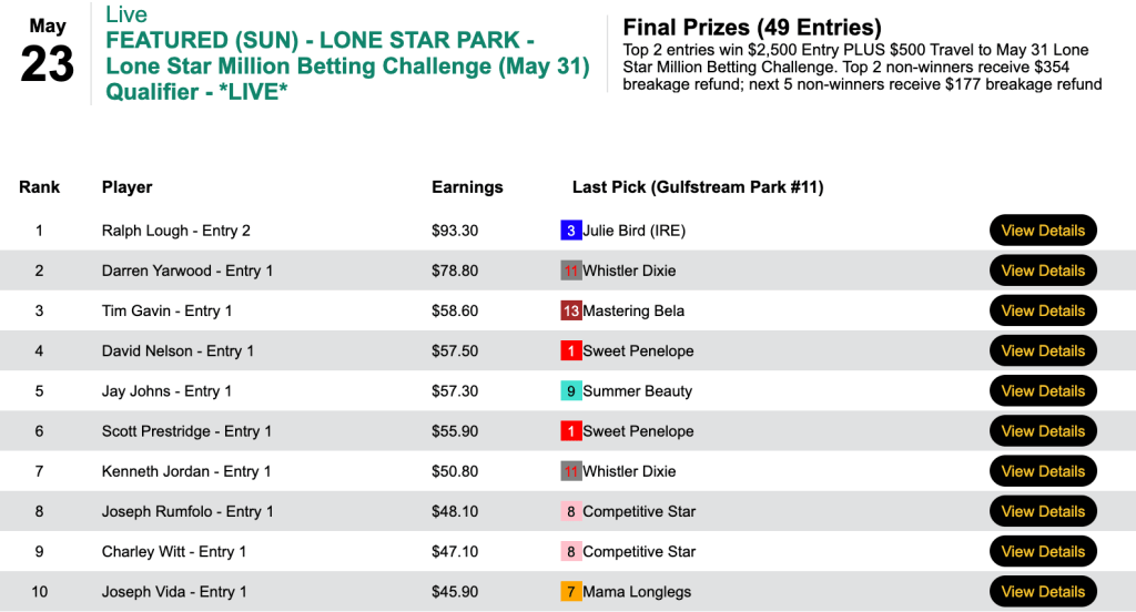 Ralph Lough (5 wins, 1 place) and Darren Yarwood (2W, 1P) made the most of this final Lone Star Million Betting Challenge opportunity, and they will be in the Texas field a week from today on Memorial Day. Both had Sailingintothewind ($32.80, $12.40) in the 7th at Pimlico.
