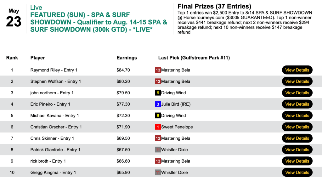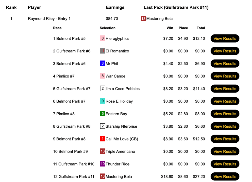 Stovall selected 4 winners—including Mastering Bela ($18.60, $8.60) in the final tourney race, the 11th at Gulfstream—plus a place to punch his ticket to the 2022 Big Dance. The runner up was the already-double-qualified Christopher Olsson. So that left the other 2022 Bally’s Berth to Mark Wilgard, who prevailed in a tiebreaker over Ray Arsenault by virtue of having 3 place collections to Arsenault’s 2. (They were tied in number of wins.)