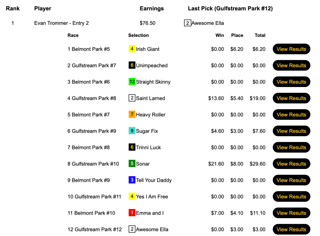 See that $3.00 place collection in the last race? Utilizing the situational flexibility that Live-format tourneys afford a player, Trommer strayed from his originial thoughts and shamelessly stabbed at 4-5 shot Awesome Ella, and that modest place return moved Trommer up and over runner up John Vail, whose pick in that 12th at Gulfstream ran 4th at 6-1.