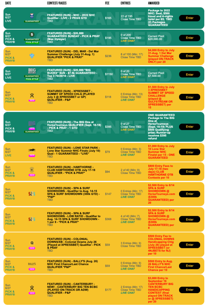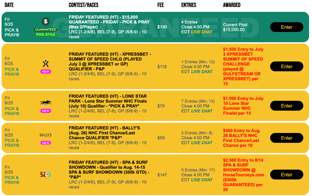 Well again offer four qualifiers this weekend to the $300,000 Guaranteed Spa & Surf Showdown here on August 14-15. Friday’s single opportunity is a $147 Pick & Pray with a winning ratio of 1-in-20. Winners receive a $2,500 entry into the third and final leg of the 2021 Tourney Triple series, which, as a bonus, offers sought-after tournament seats to the top performers across the three events (Flo-Cal Faceoff, Players Championship, Spa & Surf Showdown). If you finished in the top 100 in the first two legs, it means you earned points that could mean a seat to the Breeders’ Cup Betting Challenge, the Pegasus or The BIG One—depending on how you do on August 14-15.
