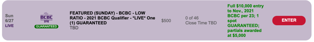 The Sunday Big Bucks game is always run in Live Format. It’s an up-to-$20,000 tourney with $7,500 Guaranteed and an admission charge of $1,150. Entries are limited to 20, and payouts go just to the top three finishers.