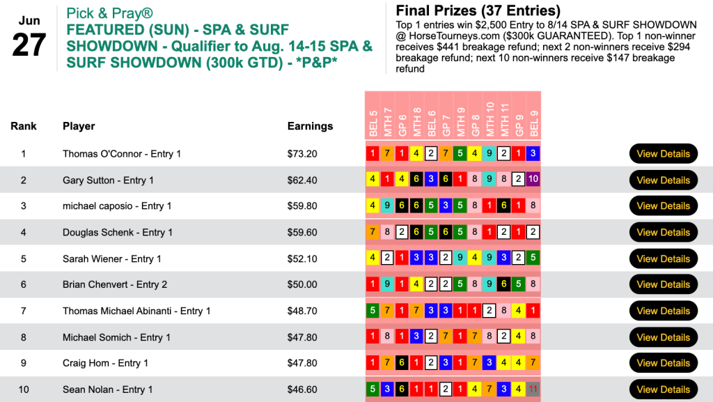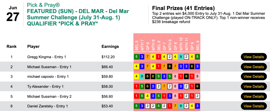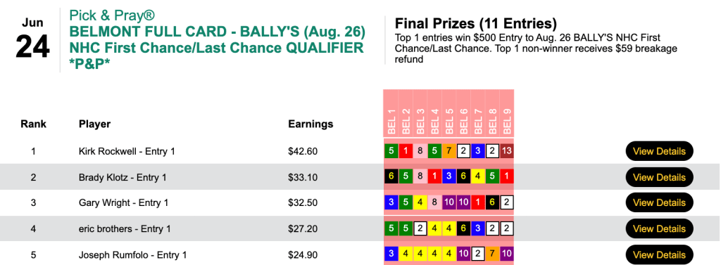 He had 2 winners (including Don’t Losemymoney) followed by 3 places to win a $1,000 entry in Sunday’s Guaranteed Lone Star Summer NHC Finals qualifier. Nieswiadomy also finished second (just 20 cents behind) with his other entry—despite the fact that he used two different horses in all 12 contest races.