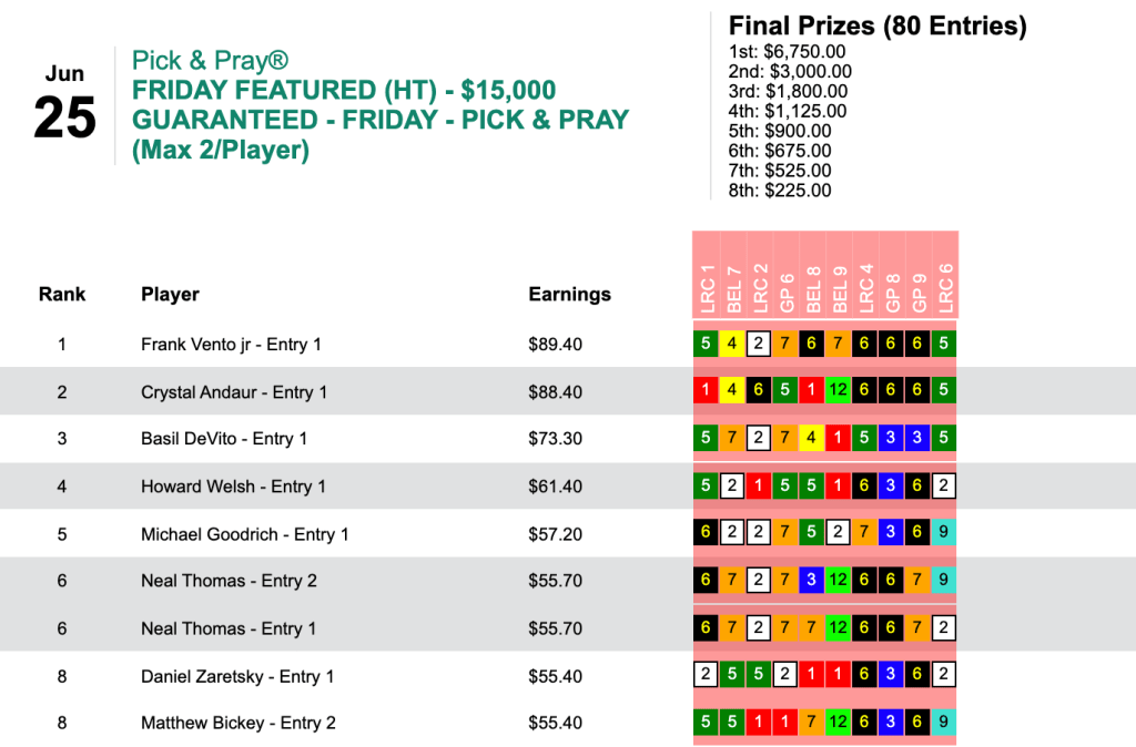 Special Friday kudos go to Frank Vento, Jr., who managed to conquer Andaur in the day’s $15,000 Guaranteed Pick & Pray, which went off with just a 1.3% takeout rate to players.