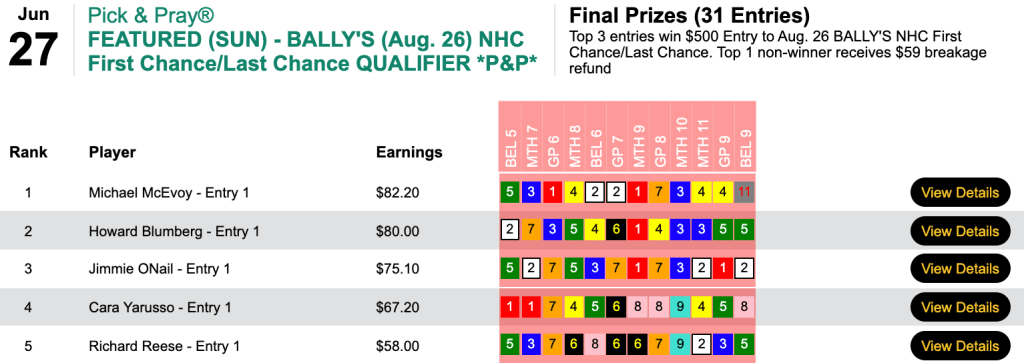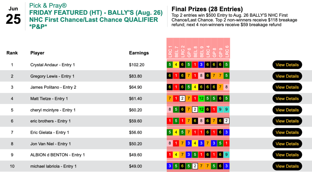 Fox Rox was also a common denominator for Sunday’s three earners of $500 entries in our Bally’s NHC First Chance/Last Chance qualifier.