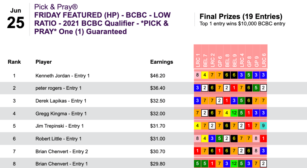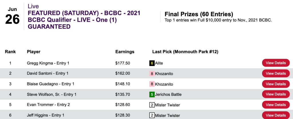 The player who did the best job of piecing things together was Ken Jordan, who only had 2 winners (with the top price of those two being just 7-2), but he chipped up repeatedly with six important place collections to snatch up the coveted $10,000 BCBC entry.