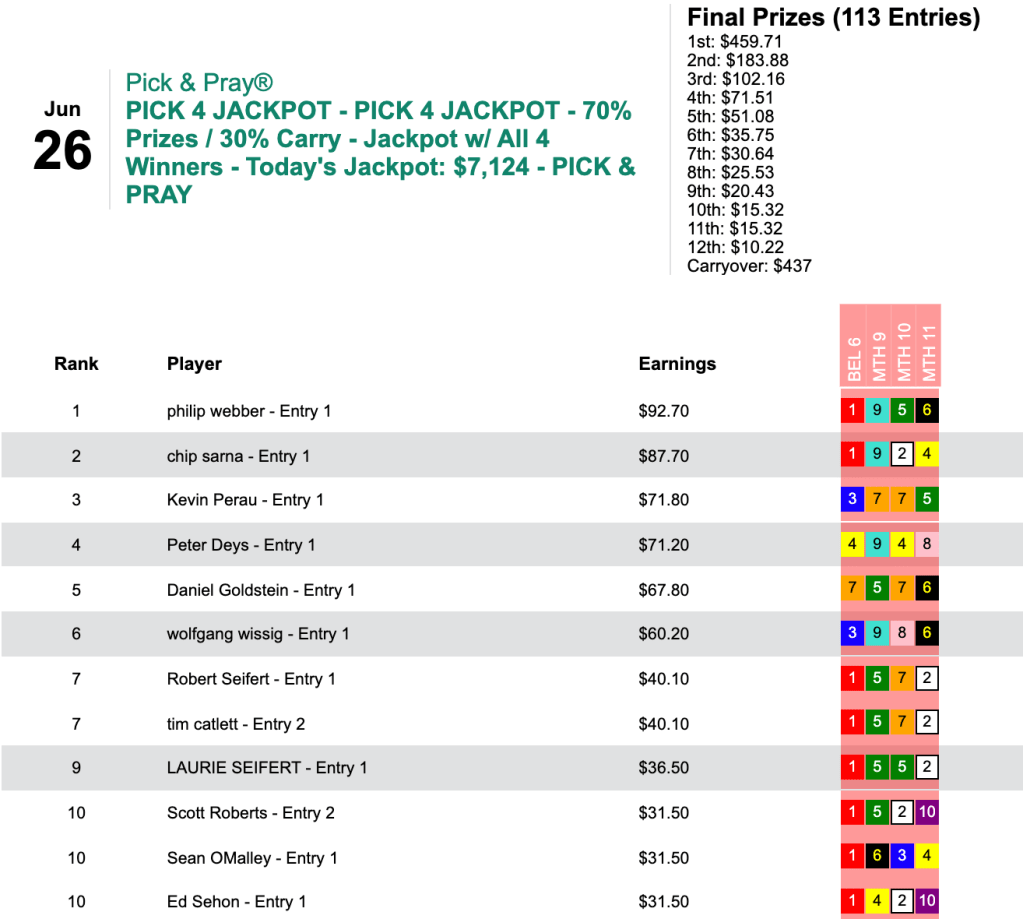 Wallbaum went down the aisles and put 3 winners and 3 places into his cart, including Introspection ($13.40, $5.60 in the 8th at Delaware). The six collections earned Wallbaum the top prize of $2,892.