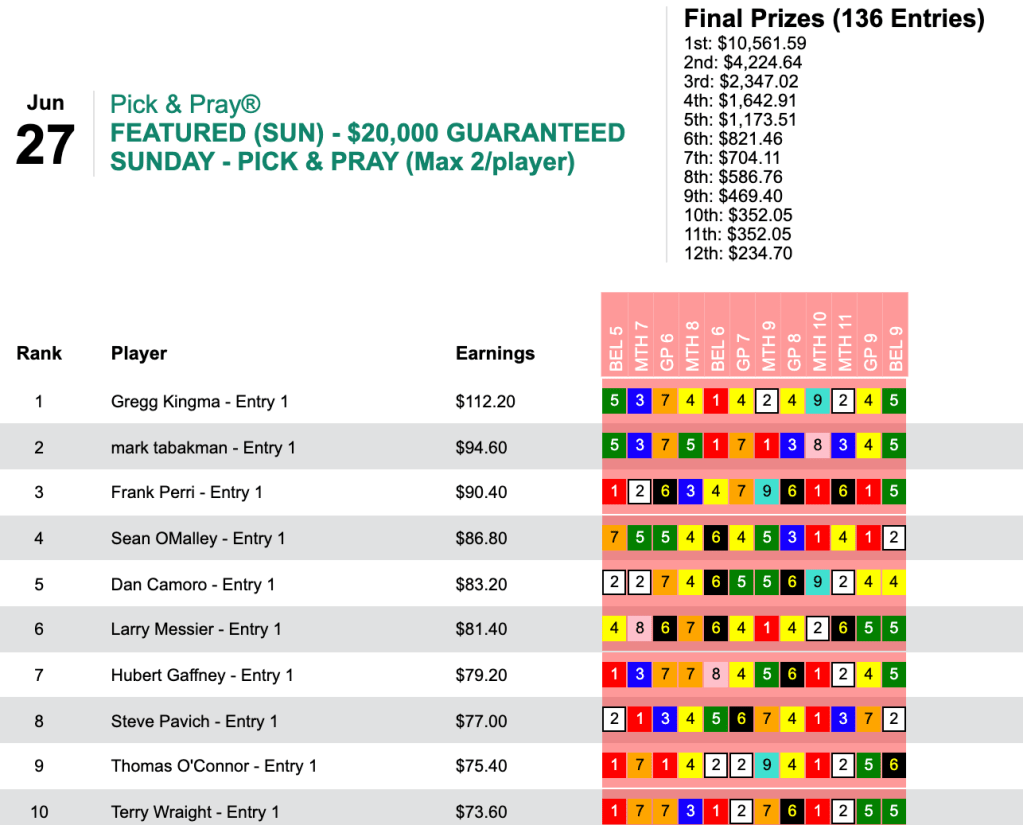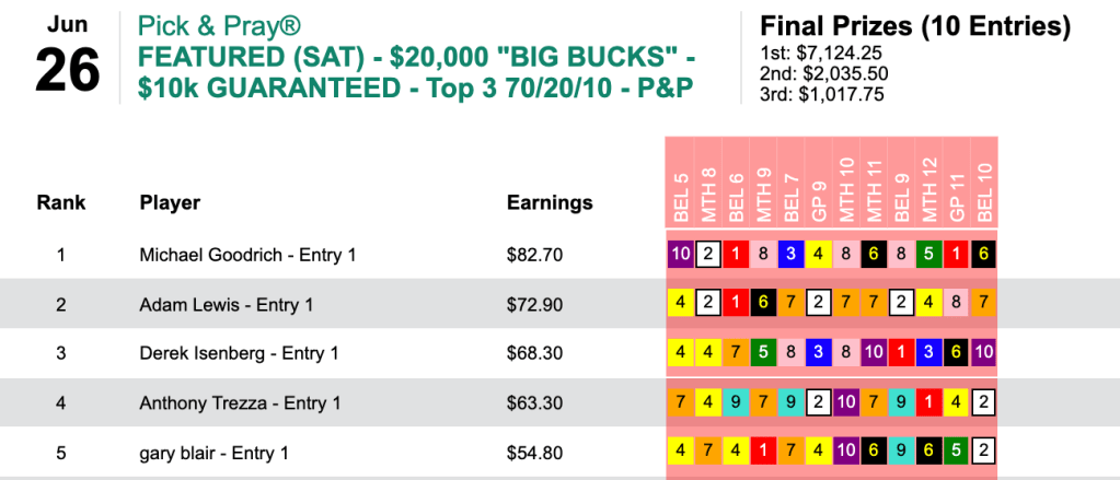 Goodrich added two more winners thereafter en route to a triumph worth $7,124 in Saturday’s $10,000 Guaranteed Big Bucks Pick & Pray.