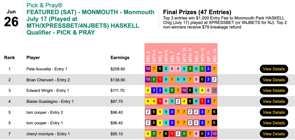 The rare $200+ scorecard got Acocella a July 17th $1,000 entry in our Monmouth Park Haskell Challenge Pick & Pray.