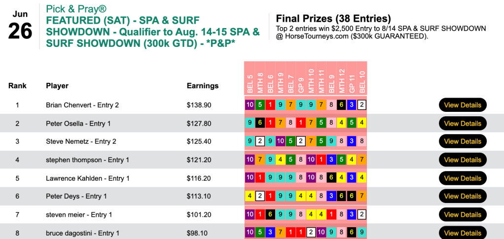 Over at HorsePlayers, John Holmes recorded 2 wins and a place in the final three tourney races.