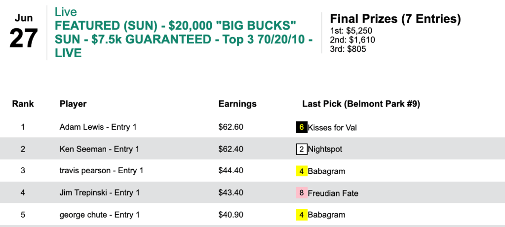 Adam Lewis prevailed by 20 cents over Ken Seeman in Sunday’s $7,500 Guaranteed, Live-format Big Bucks game (just 6.8% takeout in this one).