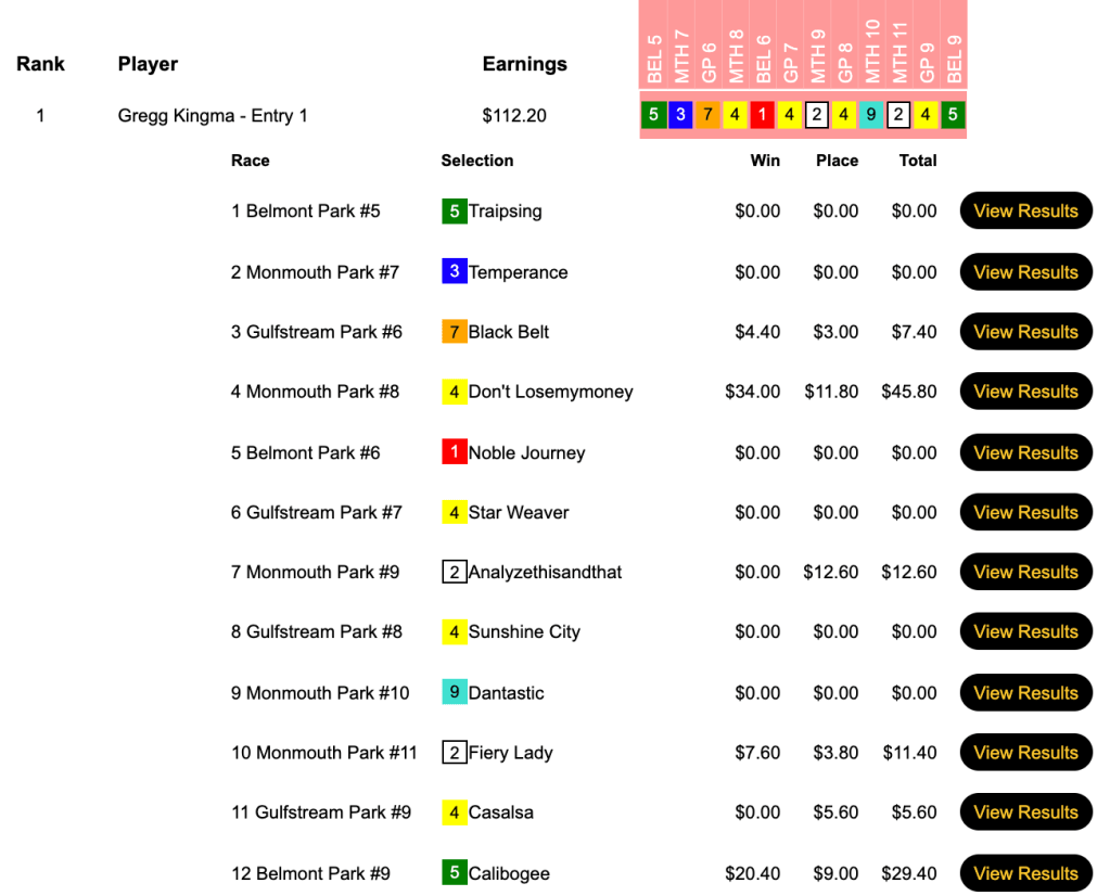 The two to top the century mark were the two to secure berths to the 2022 event: Mark Wilgard (4 wins, 2 places) and Wayne Tam (also 4W, 2P). They both had Don’t Losemymoney ($34.00, $11.80) in the 8th at Monmouth and, happily for them, the horse complied.