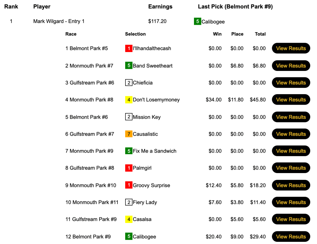 Vento (4 wins, 2 places) finished very strongly here with a $12.00 winner in the 9th at Gulfstream followed by the aforementioned Silent Musketier at 9-1. He bagged top money of $6,750. Andaur didn’t score quite as well in this one as in her two victories, but she still walked away with a very nice consolation prize of $3,000.