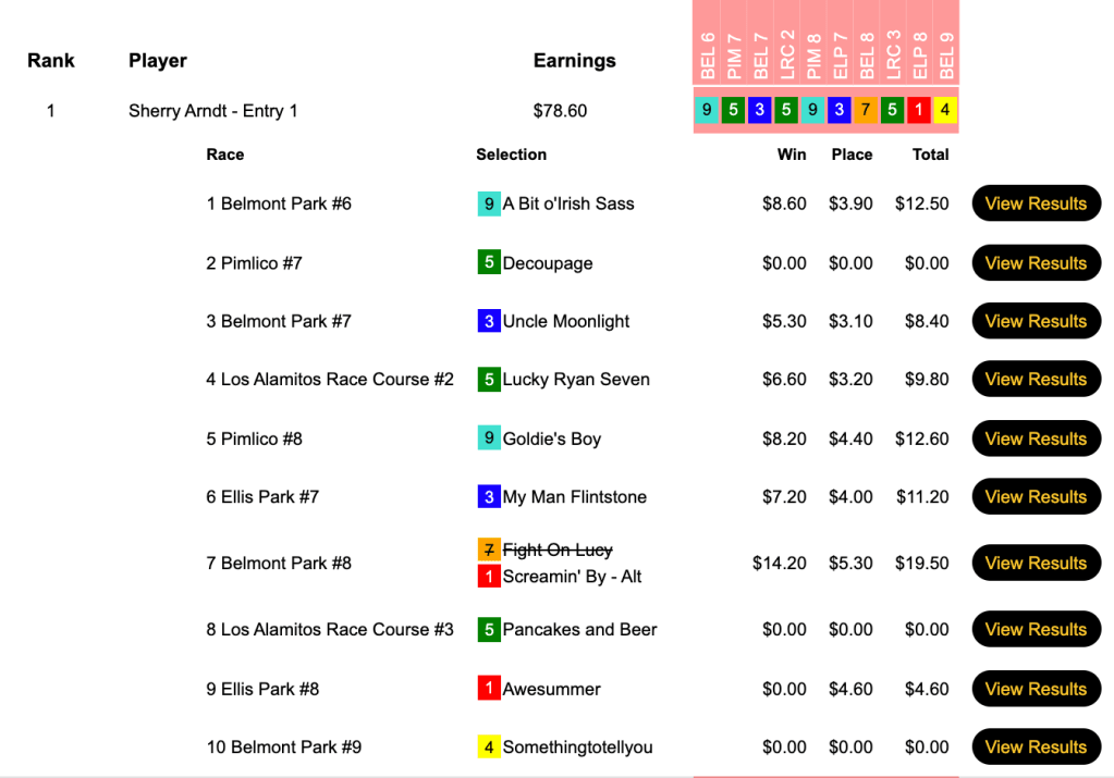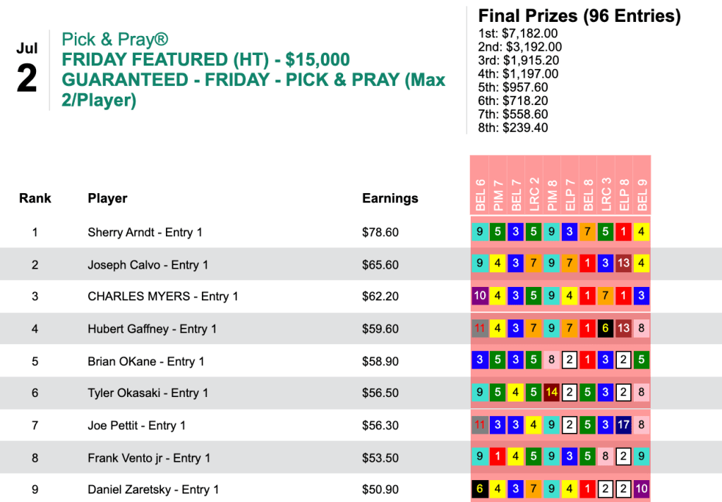 Arndt hit ‘em where they were—in the winner’s circle—6 times, including one stretch of five straight winners in mid-tourney. The biggest of those was Screamin’ By ($14.20, $5.30) in the 8th at Belmont. To the half-dozen firsts, she added one second, and that allowed her to take home $7,182 in Friday’s $15,000 Guaranteed Pick & Pray, which had a final pot of $15,960.