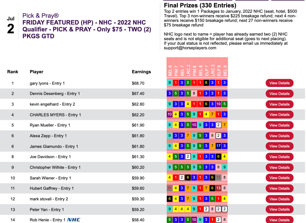 When the dust settled, it was Gary Lyons (5 firsts followed by 2 seconds) and Dennis Dusenberg, who emerged with the low-cost 2022 NHC seats. They both had Screamin By ($14.20, $5.30 in the 8th at Belmont) as their highest-yielding selections. Six of their 10 respective selections were held in common.