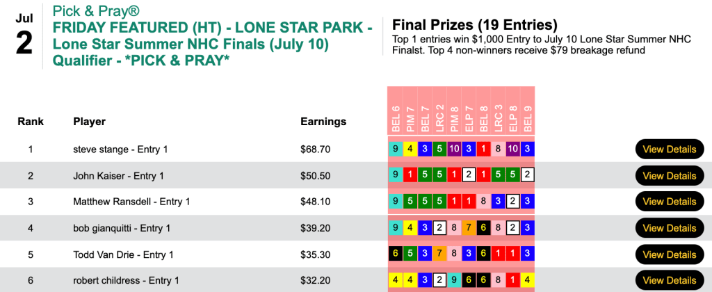 The Friday winner of the $1,000 Lone Star entry was Steve “People Are” Stange. He posted 5 wins and 2 places on the day.