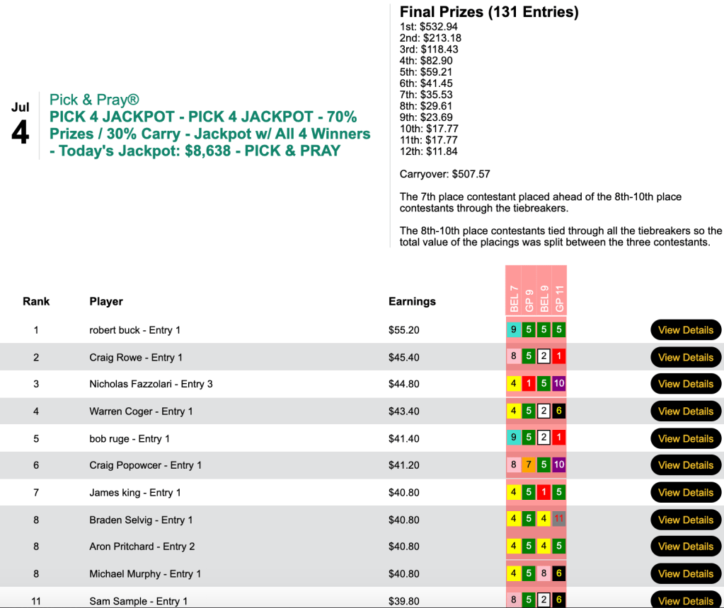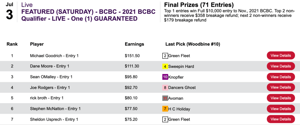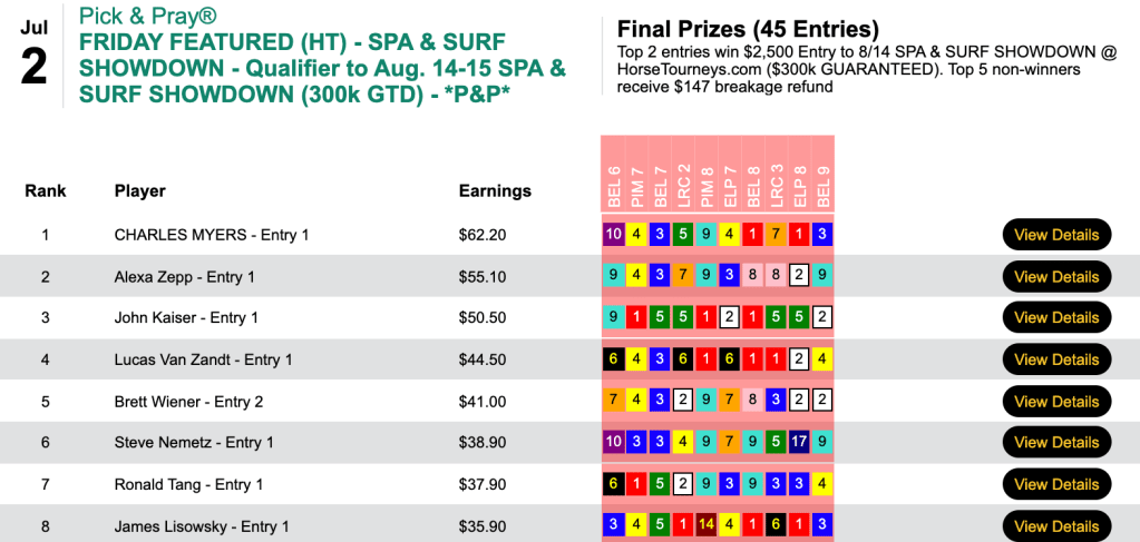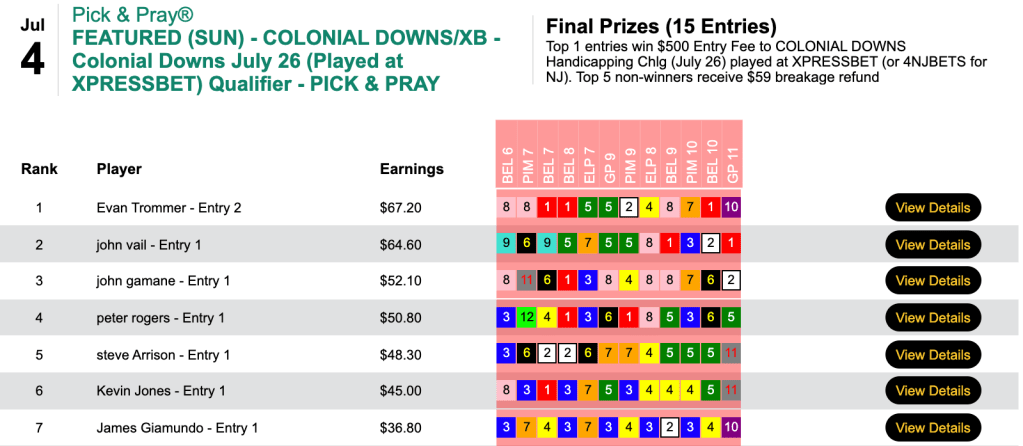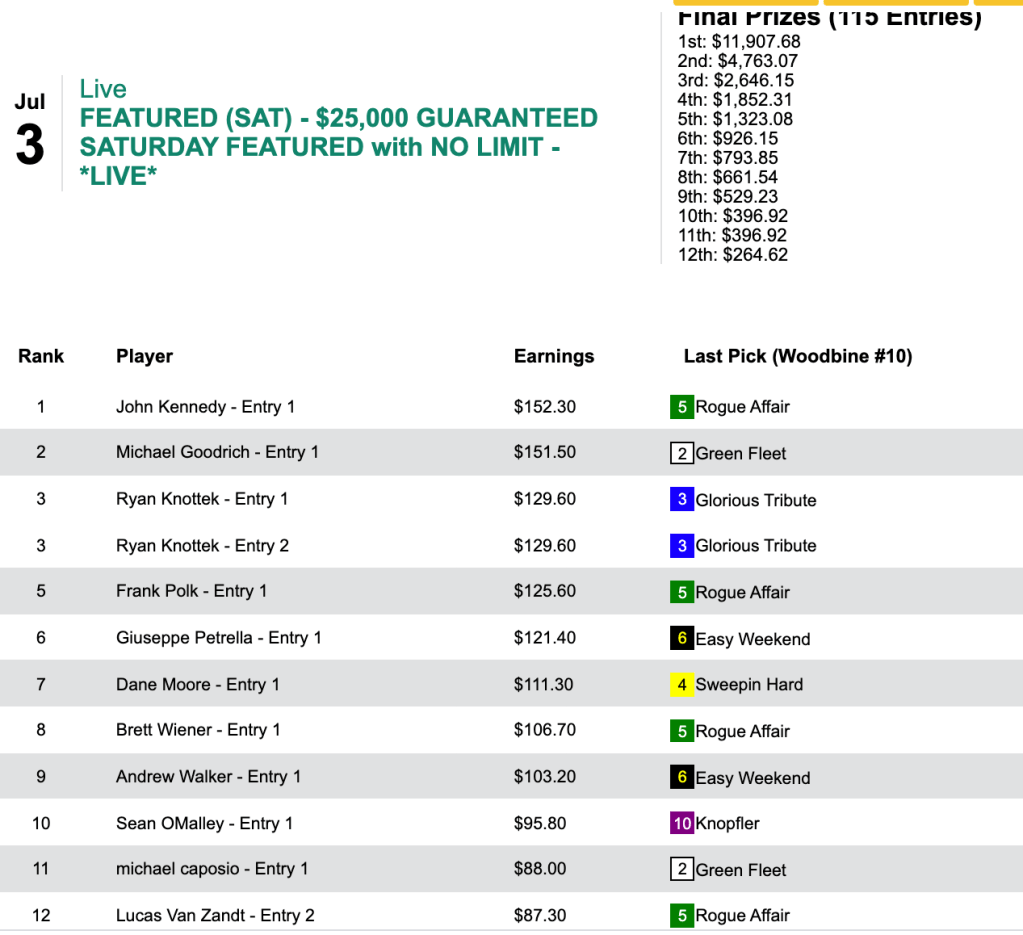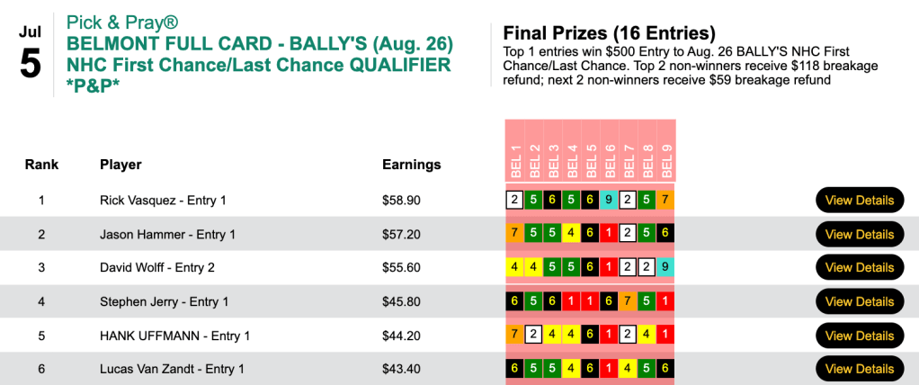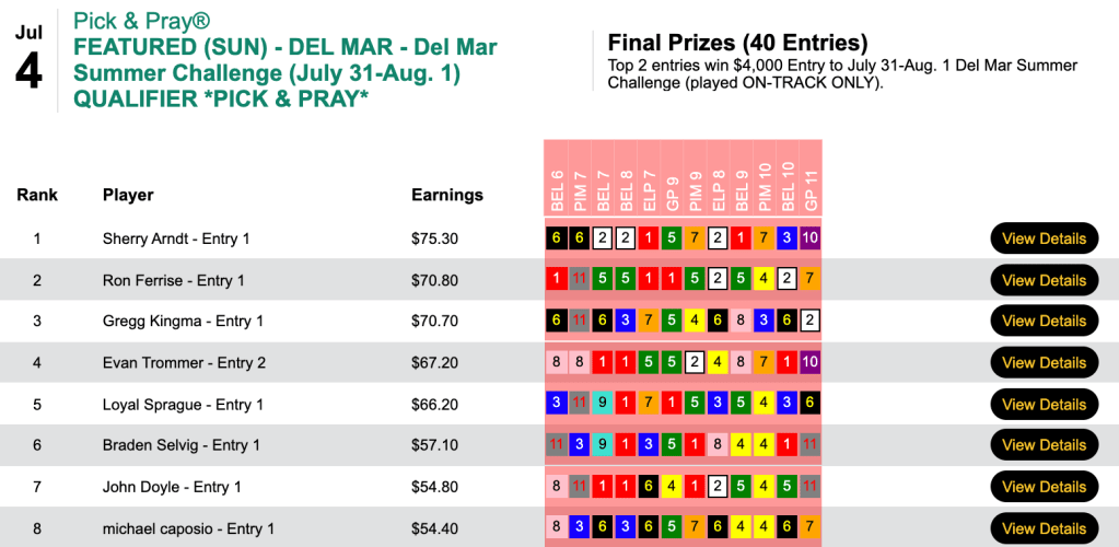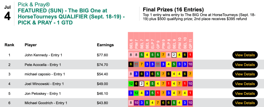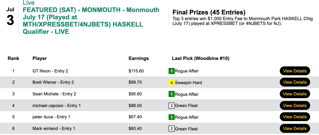 That helped enable the trio to all grab $1,000 Monmouth Park Haskell Challenge seats for July 17th. Luca and Bennett each had 6 winners and 1 runner up. Engelhard shamed himself by having 6 winners but not a single place collection.