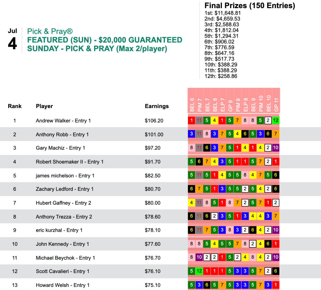 Those six winners rewarded Walker to the tune of $11,648 in Sunday’s $20,000 Guaranteed Pick & Pray.