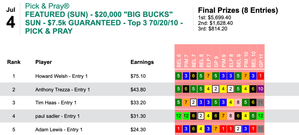 The 3-year-old grass sprinter who bottomed out his elders was among 3 winners and 2 places booked by the Garden State high-end player. That meant a winner’s share of $5,699 for Welsh in the $7,500 Gtd. Big Bucks game (run as a Pick & Pray on this particular Sunday), which closed with a total pot of $8,142.