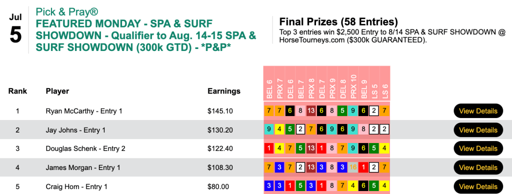 He had the final two contest winners at odds of 5-1 and 7-2, respectively, to get up for the victory in Sunday’s Spa & Surf Showdown qualifier.