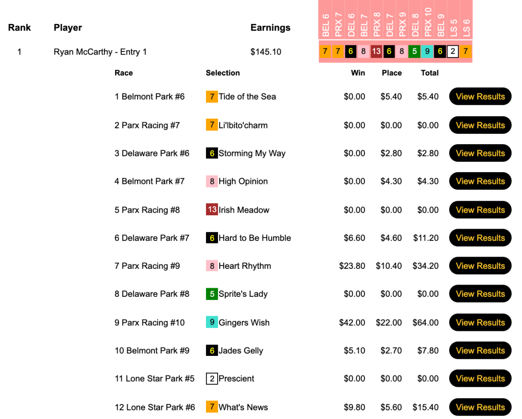 Fortunately one of those scores (the third one) was his. He, along with winner (and day-best scorer) Ryan McCarthy (5 wins, 3 places) and runner up Jay Johns (4W, 2P) all had Ginger’s Wish at Parx.